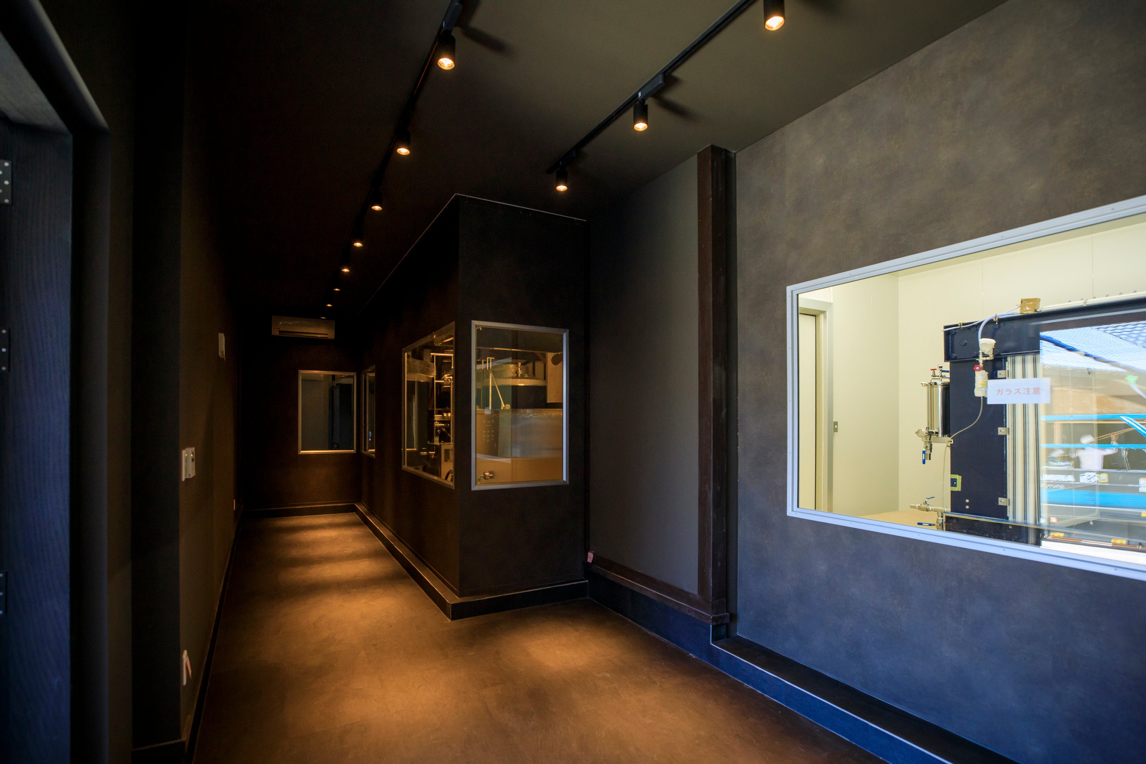 “魅せる酒蔵“をコンセプトにした新生『伊豆本店』では、酒造りの様子を見学できるスペースを設けています。蒸米の様子や発酵タンク、圧搾機など、蔵人たちの熱心な作業の様子をガラス越しに間近でご覧いただけます。