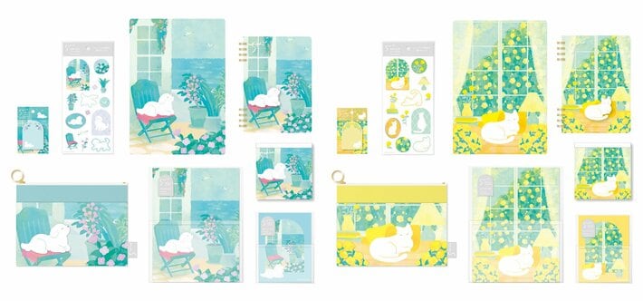 第1弾では、イラストレーター・宮下和さんとコラボレーションします。デザインは、海辺の白い街でまどろみながら飼い主の帰りを待つ犬を描いた「海風と犬」と、窓辺の陽だまりの特等席で心地よく目を閉じている猫を描いた「窓辺の猫」、2つの世界観を楽しめます。ラインアップは、『下じき』『ノート』『メモパッド』『レターセット』『ミニレター』『付箋』『シール』『ポーチ』の全8アイテムです。