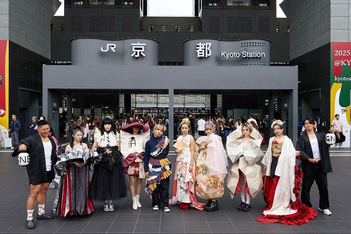 第1回京都駅ビル芸術祭(ゲイジュツ ノ エキ 2025/GNE)にてアップサイクル着物を纏ったギャルがアートスポットを練り歩く