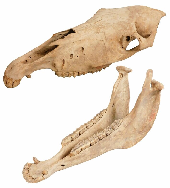 このウマの頭骨は、約60年前に実施された地下鉄4号線(現・Osaka Metro長堀鶴見緑地線)の森ノ宮駅の工事中に地下約5mの地層から発見されました。この周辺の地下約10mの地層からは、ウマの肢や腰の骨も見つかっています。正確な地質年代は分かっていませんが、それらの地層が堆積した当時の日本には、既にウマが生息していたことを教えてくれます。漢字はもちろん「馬」です。