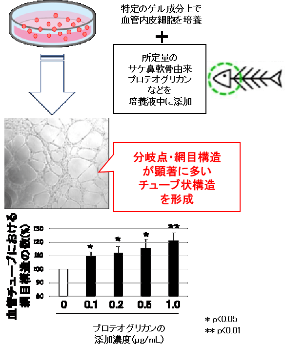 血管新生が盛んな発生期・発達期の脳組織は、コンドロイチン硫酸型プロテオグリカンの一種(アグリカン)が豊富な環境下にあることが、共同研究の成果として明らかになっています。この点に着目し、生体内を模倣できる環境を模索した結果、特定のゲル成分と、サケ鼻軟骨もしくはウシ鼻中隔の抽出・精製物からなる所定量のプロテオグリカン材料を培養液中に添加することで、顕著な血管新生促進作用を示すことを発見しました。