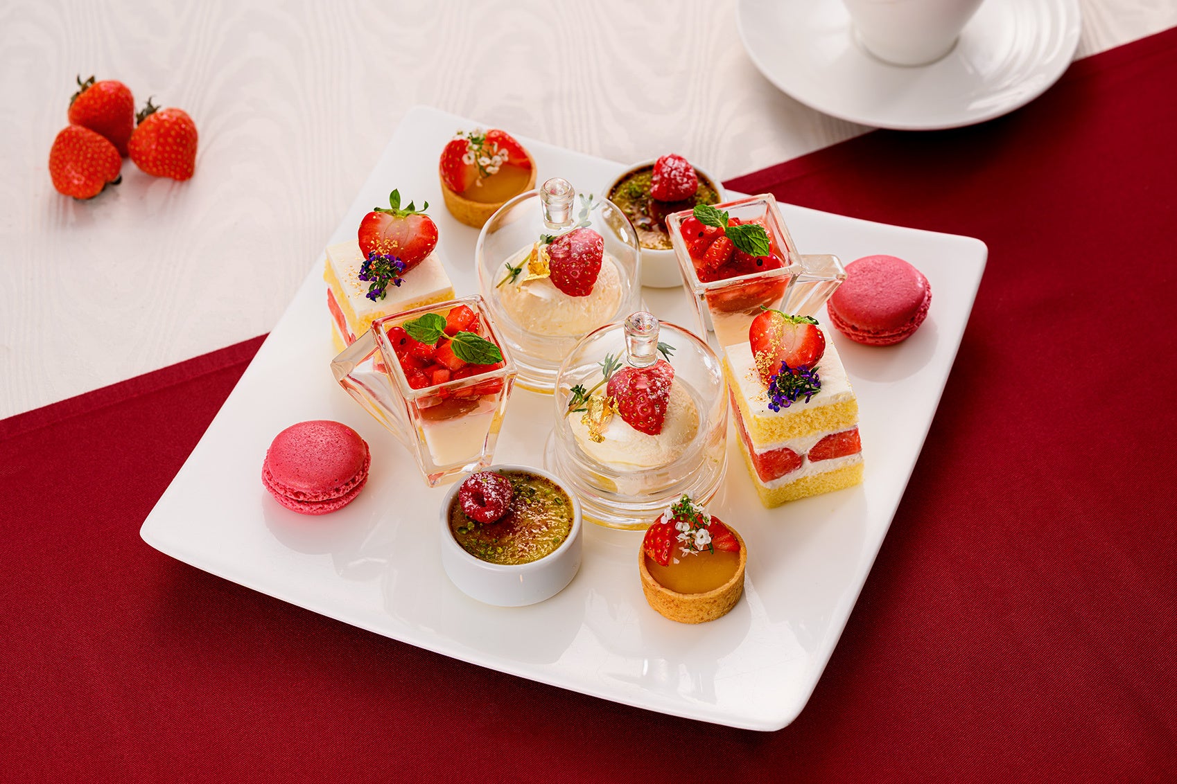 苺を贅沢にあしらい、素材の持ち味を丁寧に重ねた季節のデザートが揃います。パティシエが層のバランスにこだわり、丸の内はちみつやライムの香りを繊細に効かせた「苺尽くしのパフェ」、軽やかなパイ生地とプラリネヘーゼルナッツの奥行きある風味を生かした「苺のミルフィーユ」、焼きメレンゲの食感と柚子クリームの爽やかさを組み合わせた「苺のヴァシュラン」など、苺の華やかな魅力を引き立てるラインナップです。ティータイムをより豊かに彩る、洗練されたひと皿をご堪能ください。