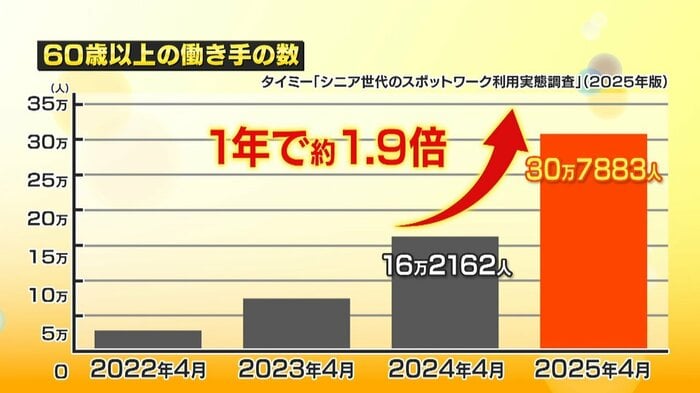 スキマバイトアプリの「タイミー」によると、60歳以上のシニア世代の働き手は、今年(2025年)4月時点で、約30万8000人と、1年で2倍近くに増加。