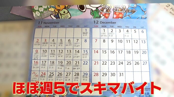 スキマバイトの予定が書かれたカレンダーを見せてもらうと、週に5回前後入っていることが分かります。