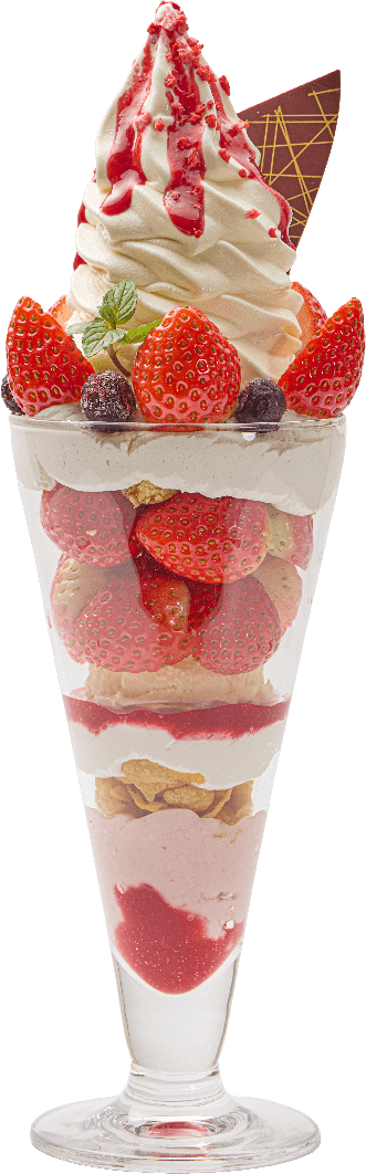パフェのトップには、まろやかでコクのあるミルクの風味が特長のバニラソフトをたっぷりと乗せました。口に入れた瞬間に、苺の酸味とやさしく溶け合い、ふわりととろけるなめらかさが味わえます。