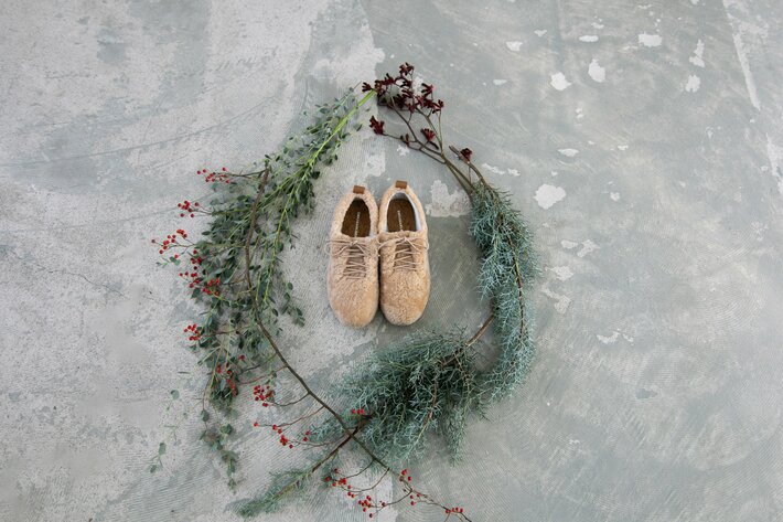 天然ムートンを全面に使用したレースアップシューズは、見た目はシンプルでも、形づくりに繊細な調整が必要な靴です。