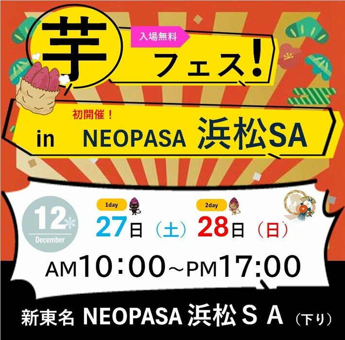 東海地方を中心に延べ30万人を動員しているあの芋フェス!が清水SAに続いて浜松SAにおいて、2025年12月27日~28日に開催が決定いたしました。イベント名は「第1回芋フェス!IN浜松SA(下り)」となりますでの開催がでの開催が決定した。
