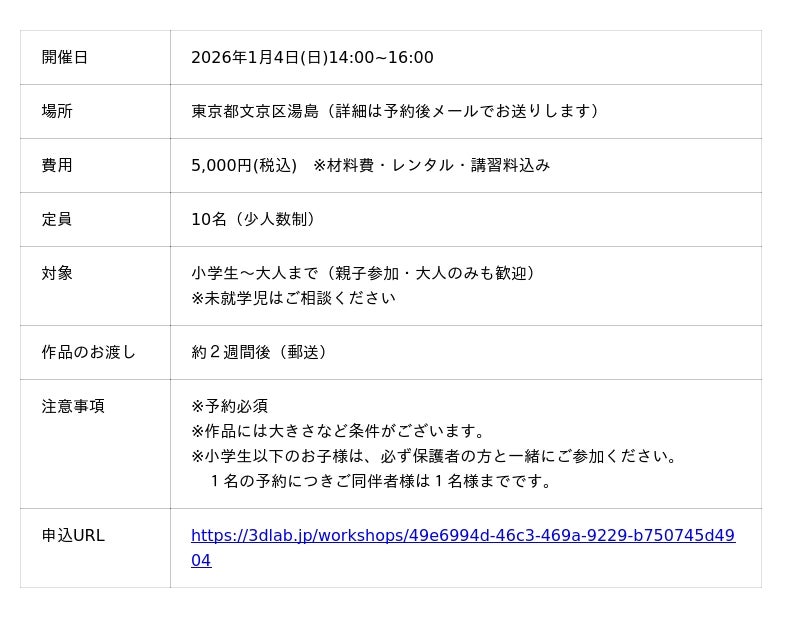 【URL】https://3dlab.jp/workshops/49e6994d-46c3-469a-9229-b750745d4904