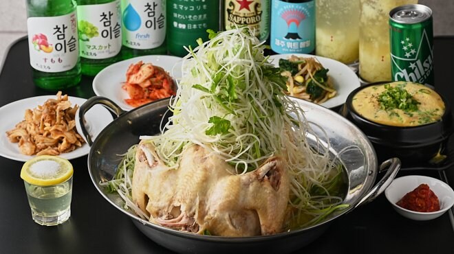 韓国語で「鶏一羽」(「タッ=鶏」「ハンマリ=一羽」)を表す名前の料理で、丸鶏を煮込んで鶏肉とその旨味が溶け出したスープを味わいます。