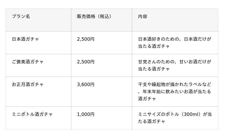 当たるお酒のラインアップには1本55,000円(税込)の30年熟成させた日本酒「天琥 -tenko- 30年」など、一般販売していないレアなお酒も入ります。他にも年末年始に飲みたいお酒が当たる「お正月酒ガチャ」では、干支や縁起物が描かれたラベルのお酒が当たります。