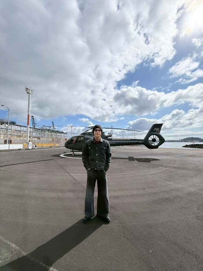 岩田さんはこの旅でヘリコプターのフライトを楽しんだようで、投稿した写真では、ヘリの機体をバックにニット帽とサングラス姿でヘリポートに立ち尽くす姿を披露。
