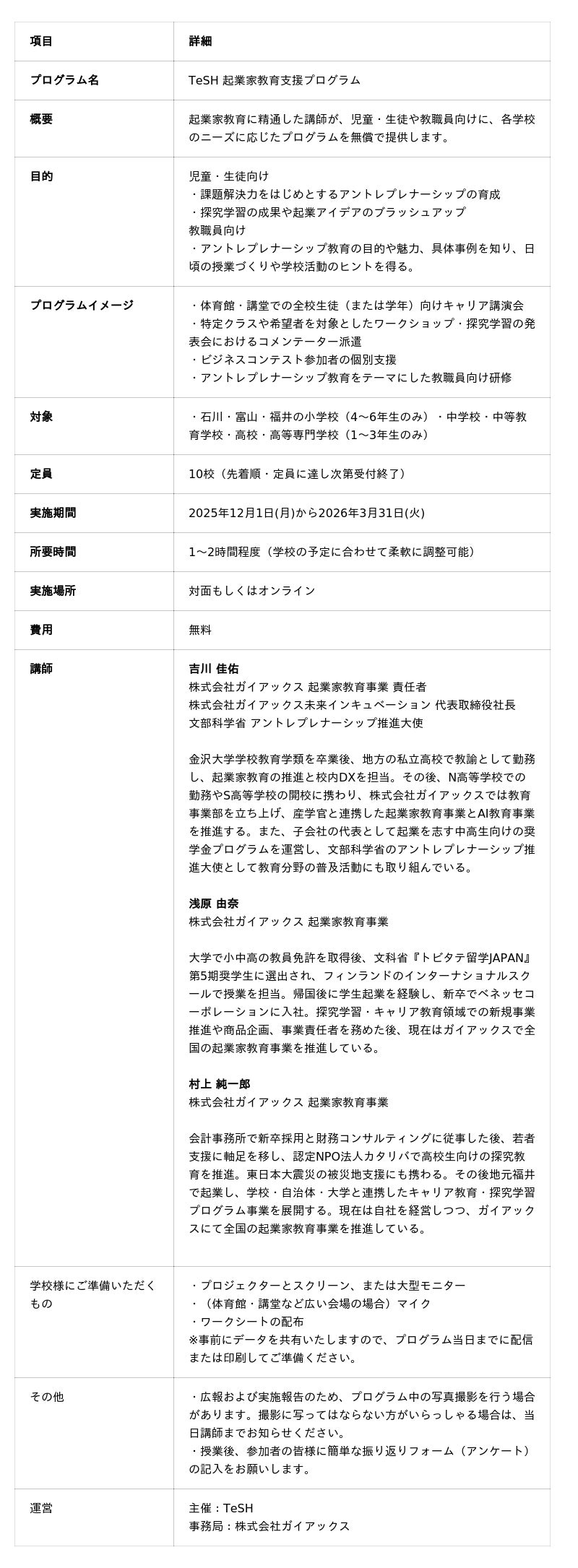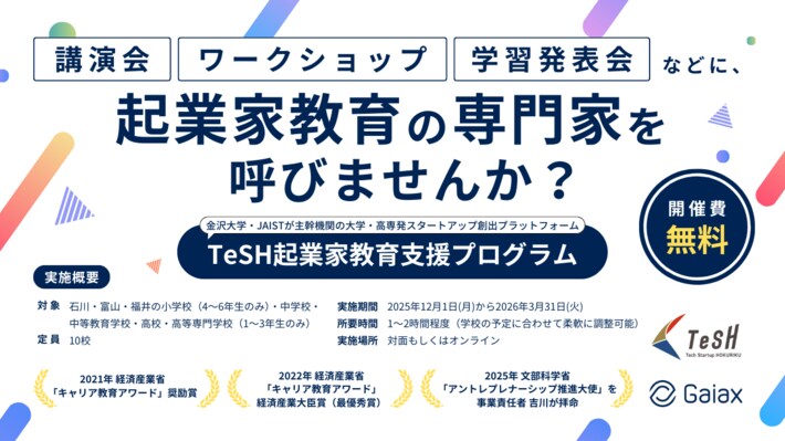 産学官と連携したアントレプレナーシップ教育プログラムを展開する株式会社ガイアックス(本社:東京都千代田区、代表執行役社長:上田祐司、証券コード:3775、以下 ガイアックス)は、北陸地域(石川・富山・福井)の大学・高専が連携するスタートアップ創出プラットフォーム「Tech Startup HOKURIKU(TeSH)」共同機関の取り組みとして、小学校・中学校・高校を対象に、起業家教育の講師を無償で派遣するプログラム「TeSH 起業家教育支援プログラム」を開始します。