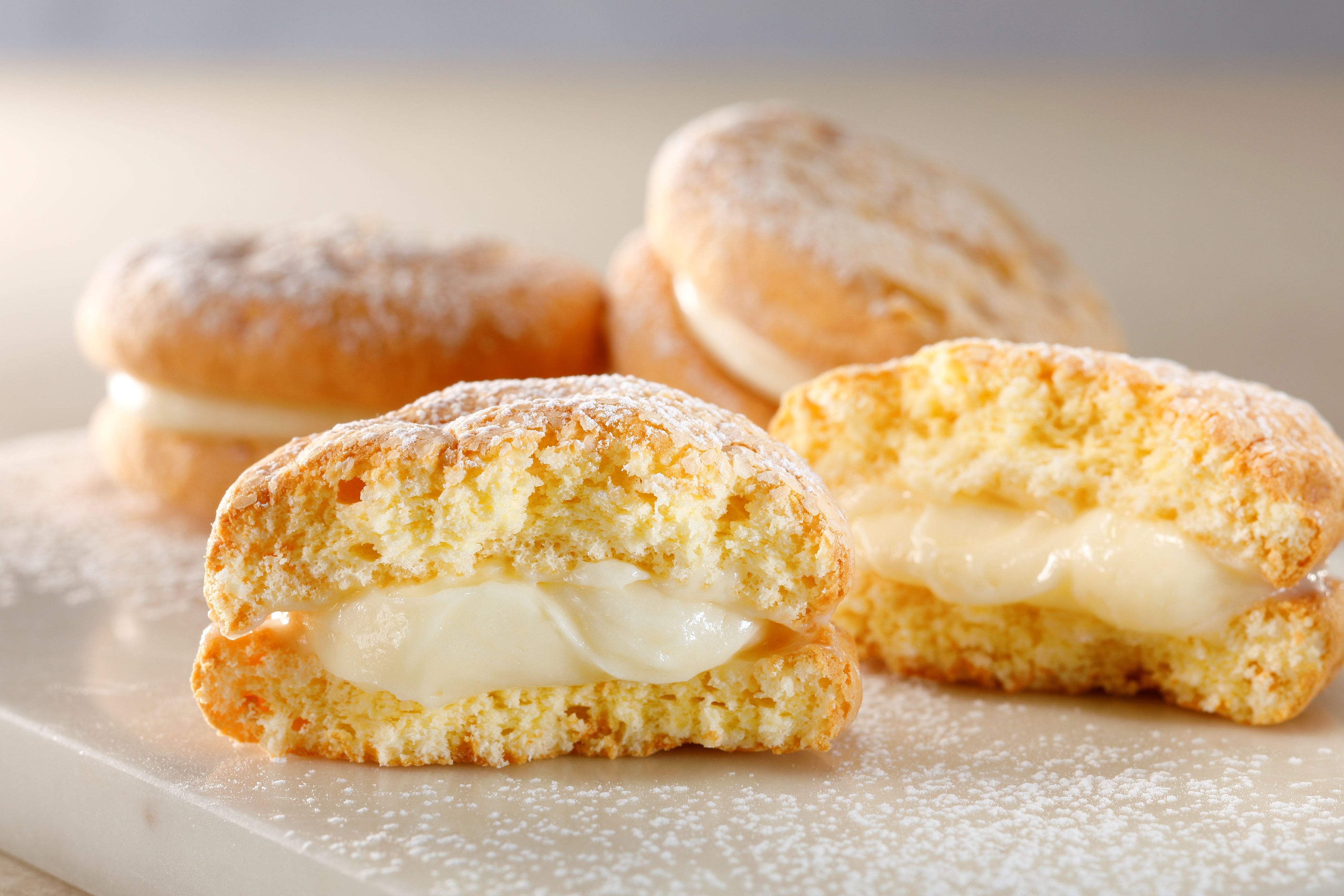 北海道産小麦のブッセ生地でカマンベールチーズで仕立てたチーズクリームをサンドしました。 ブッセのやわらかく香ばしい食感とカマンベールチーズのクリーミーで濃厚な味わいをお楽しみください。
