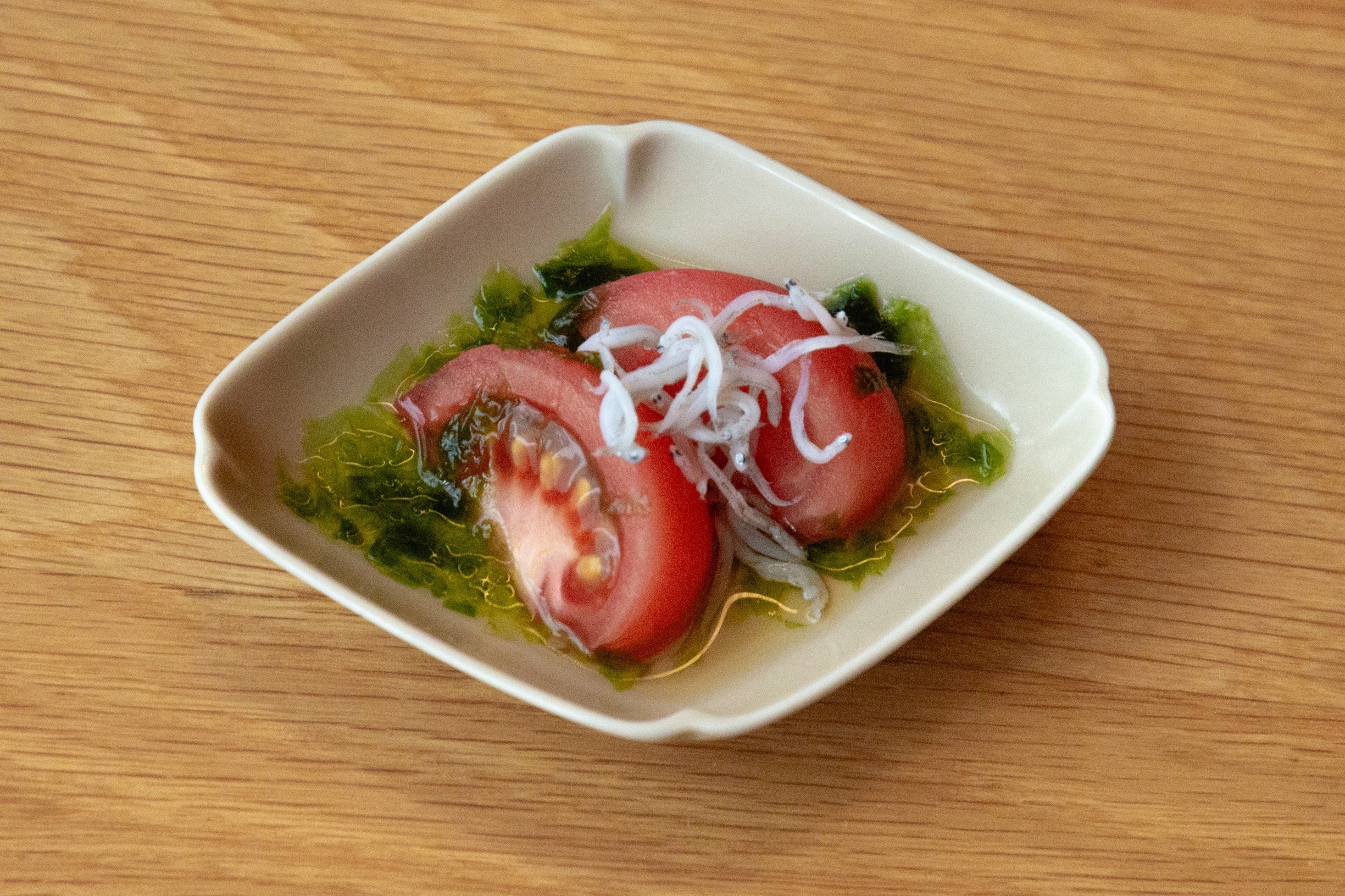 楢葉町のナラハプラントファクトリーで水耕栽培されたトマトは、甘さがありながらもクセのない味わいが魅力です。太陽の恵みを浴びて育ち、GAP認証を取得したトマトを福島県産の生のあおさを使った出汁に浸し、福島県産しらす干しを添えて、磯の香りと共にさっぱりと仕上げました。