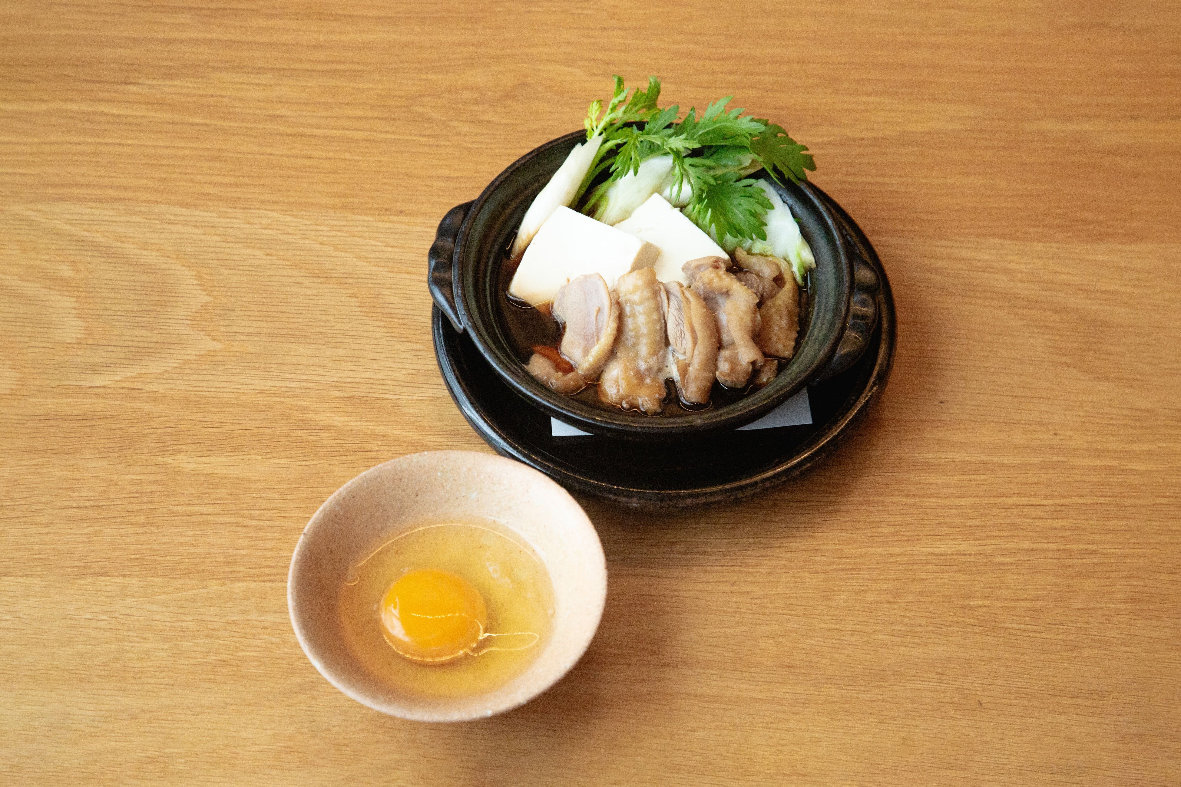福島おぜんの目玉はGAP認証取得の川俣シャモのすき煮です。伊達郡川俣町・川俣シャモファームで育ったシャモは、弾力のある肉質と濃厚な旨味が特徴で、長期間平飼いで飼育されることで締まりと深いコクが生まれます。そんな川俣シャモのもも肉を上品な甘さの割り下ですき煮に仕立てました。身も皮もプリッと引き締まったシャモを旬の野菜と一緒に、生たまごを絡めてお召し上がりいただくメニューです。
