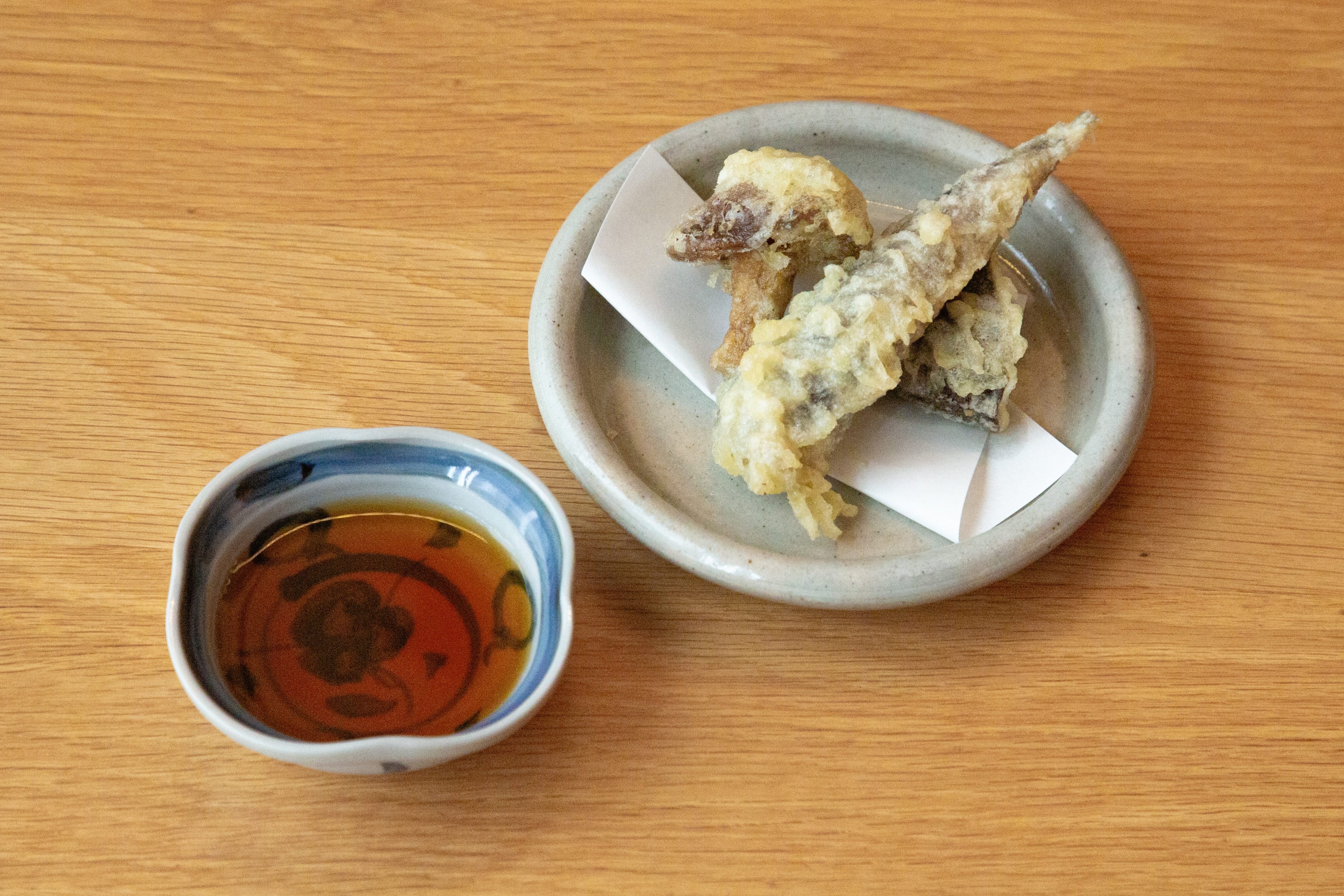 メインのお料理ではほかに、めひかり、ジャンボなめこ、生しいたけの天ぷら三点盛りをご用意しました。
