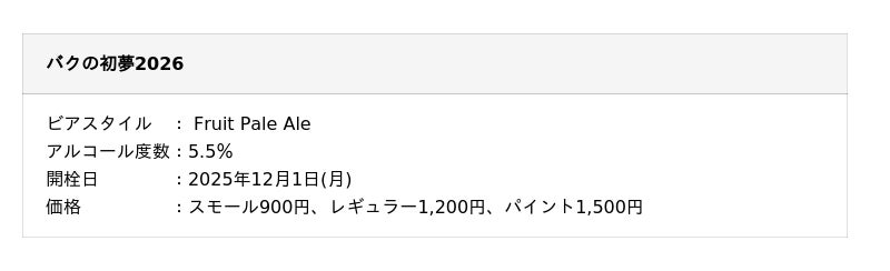 株式会社ワンダーテーブル(本社:東京都新宿区西新宿、代表取締役社長:河野 博明)は、よなよなエール公式ビアレストラン『よなよなビアワークス』にて、年末年始限定ビール「バクの初夢2026」を、数量限定で提供いたします。