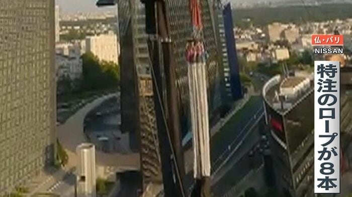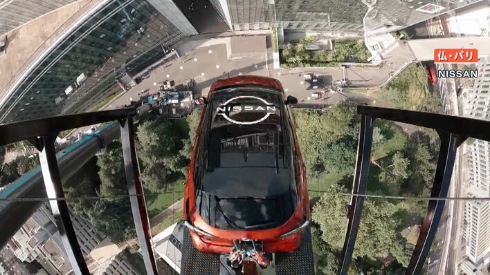 フランス・パリ。高層ビルが建ち並ぶ中、地上65mの高さまで吊り上げられた車。