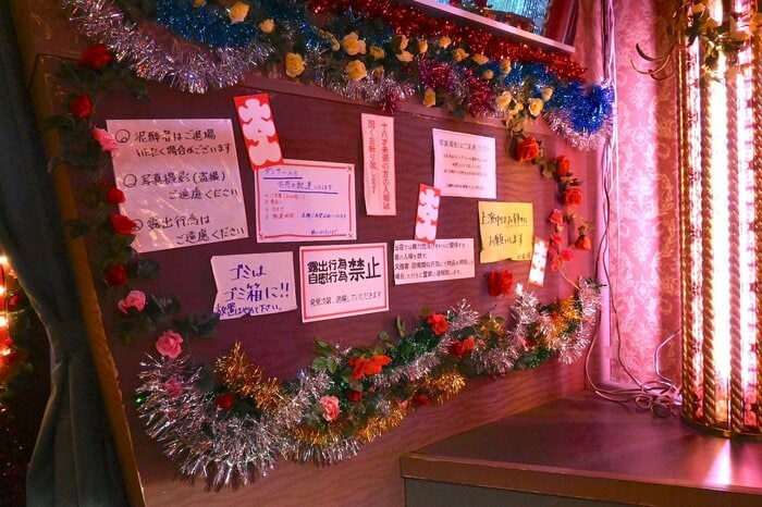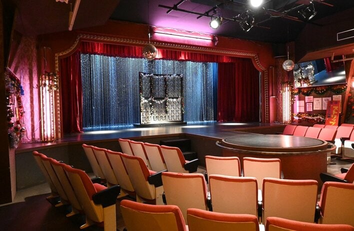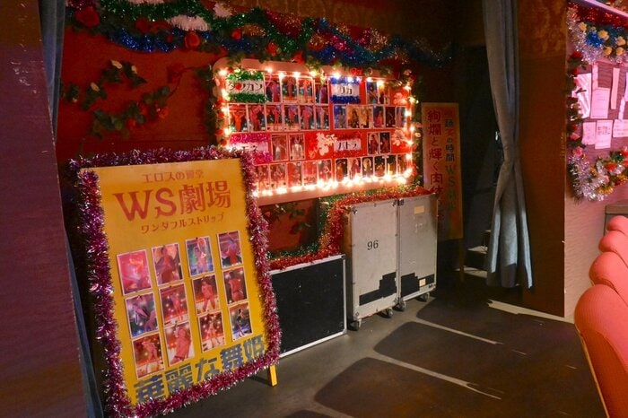 棈木さんはWS劇場について、「実際のストリップ劇場をいくつか見たうえで、ステージの高さや形などをアレンジし、演劇で使用するサイズにデフォルメをした」と言います。「赤を基調とし、画面に必ず赤色が入るように配置しています」と、こだわりも明かしました。