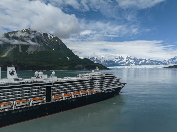 ハバード氷河に向けてヤクタット湾を進むホーランドアメリカラインのウエステルダム