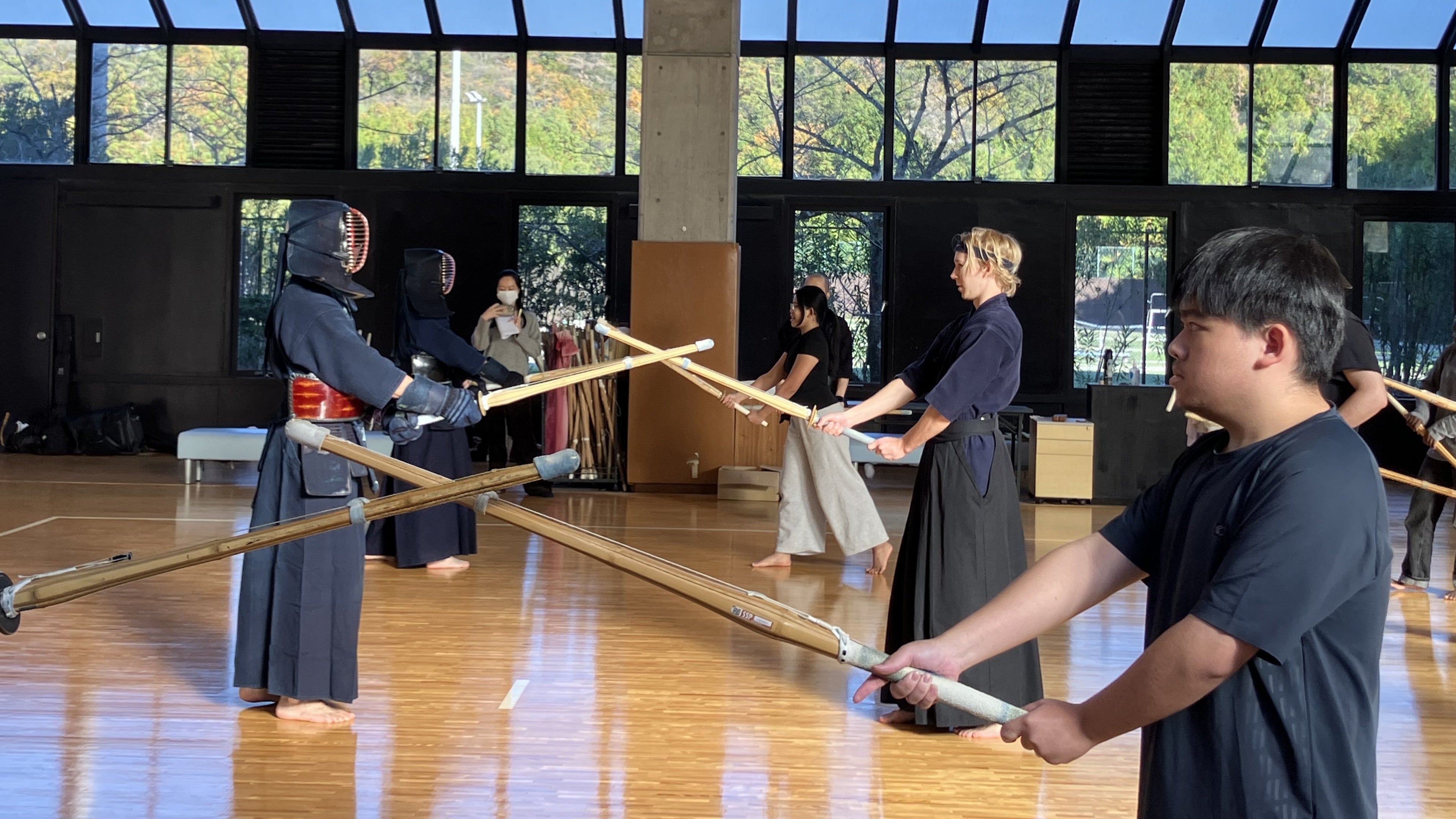 指導では、竹刀の正しい持ち方・振り方、すり足による足さばきといった基本動作を学んだのち、「面」「小手」「胴」への打突動作へと進みました。初めて竹刀を手にする留学生がほとんどでしたが、有段者の講師による丁寧な指導のもと、打突の形が出来上がっていきました。