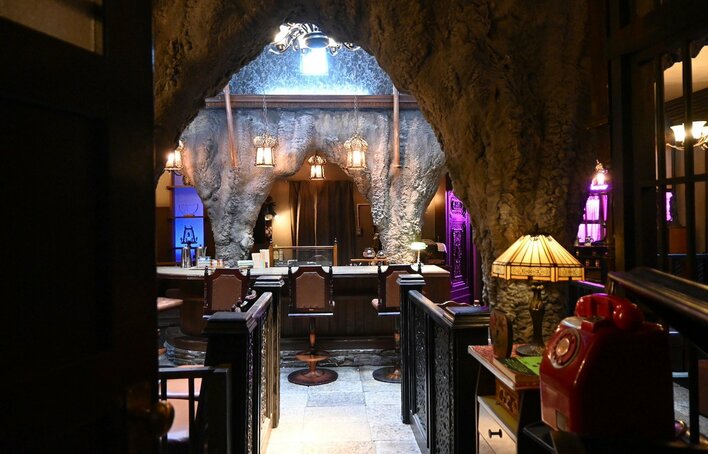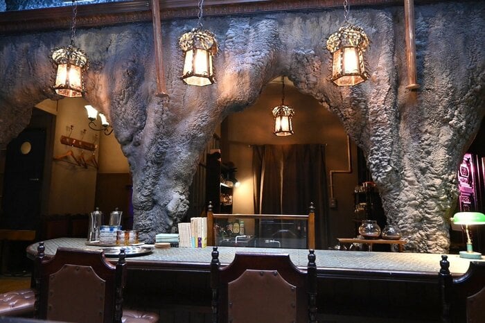 セットは、実在の喫茶店をモデルに作られているそう。そして「テンペスト」といえばシェイクスピアの同名戯曲で、洞窟のシーンが登場します。美術デザインの棈木さんは「洞窟をモチーフに取り入れて、演劇の舞台美術のようなフォルムをコンセプトにしました。正面には西浦正記監督のアイデアによる壁画を作りました」と明かしました。