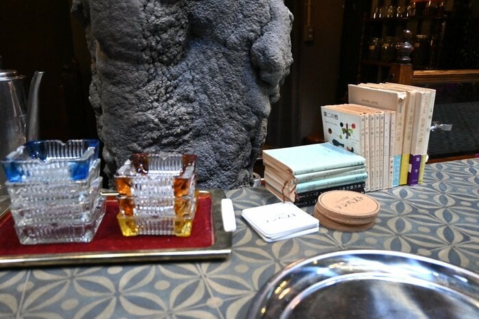 カウンター左側に寄ってみると…今では見かけることも少ないガラスの灰皿と、「テンペスト」オリジナルコースター、そしてサルトルの『自由への道』、シモーヌ・ド・ボーヴォワールの『第二の性』など、フランス文学の書物が並んでいます。
