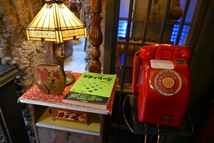そして、細部にも美術・装飾スタッフの並々ならぬこだわりが詰まっています。たとえば、店の入り口へ続く通路脇の電話コーナー、そして店奥のレジまわりにも注目。