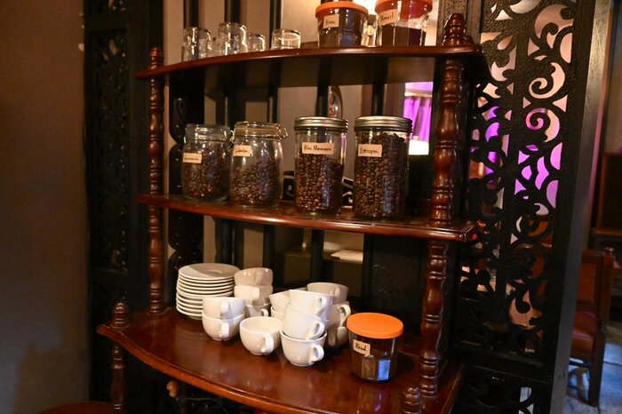 後ろには「Blue Mountain」「Ethiopia」などとラベルの貼られたコーヒー豆が。カップとソーサーは白色でシンプルなデザインです。