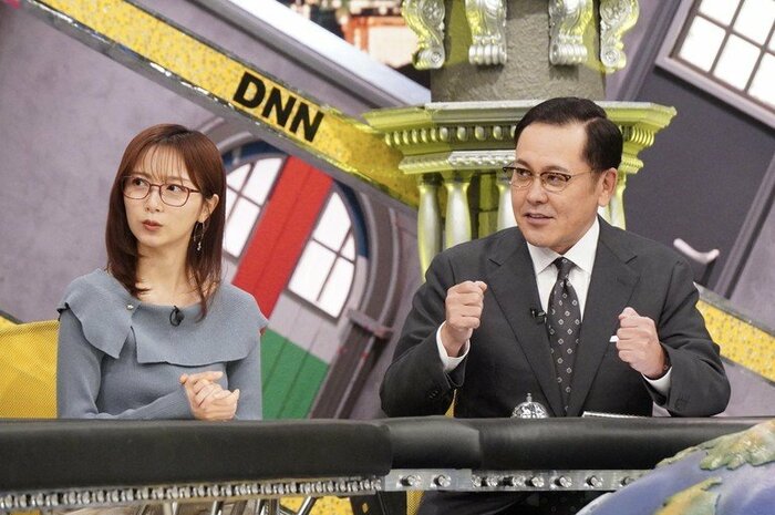専門家による2025年重大ニュースの解説中、挑戦者はトラブルが起こったらキャスターアリタの「入って」カンペで出動し、うまく場を収めます。