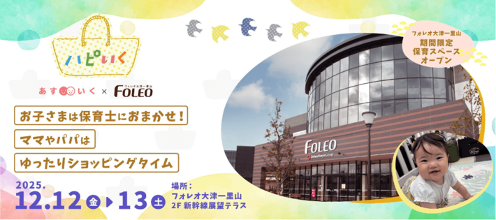 一時保育検索・予約サービス「あすいく」を運営する株式会社あすいく(本社:東京都港区、代表取締役:幸脇 啓子)は、大和ハウスグループの大和ハウスリアルティマネジメント株式会社が運営する商業施設「フォレオ大津一里山」(滋賀県大津市)にて、未就学児を対象とした保育士常駐の一時預かりサービス『ハピいく』を、2025年12月12日(金)、13日(土)の2日間限定で初開催します。同施設で“一時預かりサービス”が提供されるのは今回が初となります。