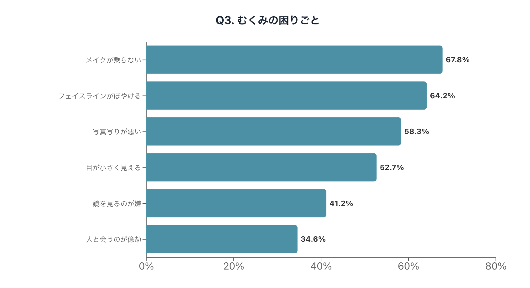 むくみによる困りごとでは「メイクが乗らない」「フェイスラインがぼやける」といった声が多く、日常生活に支障をきたしている実態が明らかになりました。