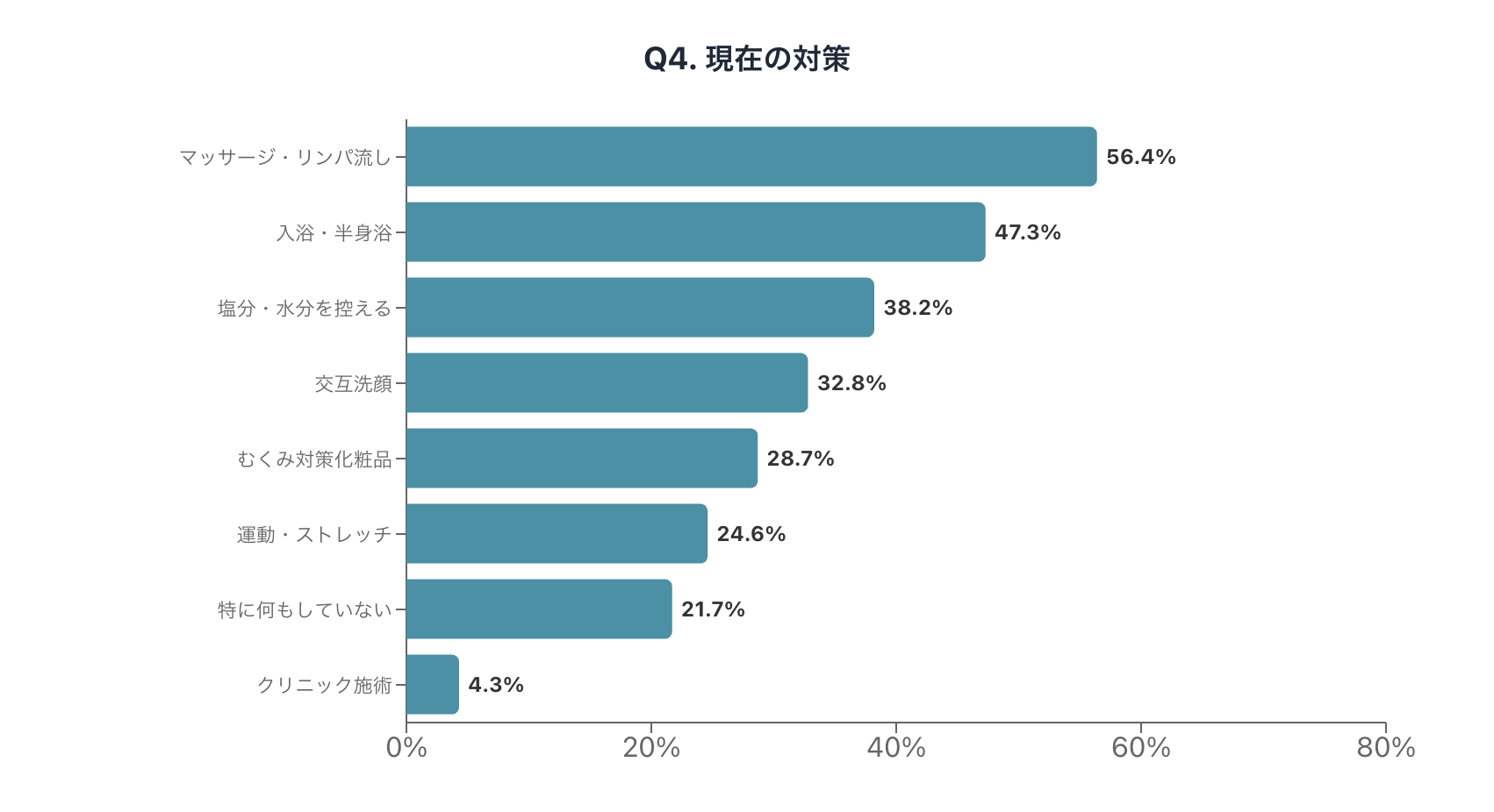 Q4. 現在のむくみ対策、「マッサージ」が56%で最多も「何もしていない」人も2割超