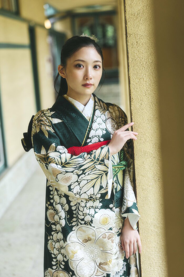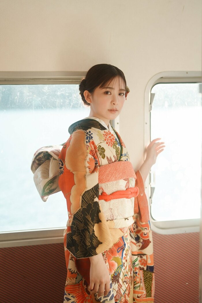遠藤さんは気持ちの良い秋晴れの日、撮影へ向かったのは、相模湖。西日が湖面に反射してキラキラと輝く光景を背に、晴れ姿を披露しています。