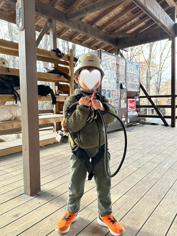 「息子はドキドキしながらもハーネスをつけてアスレチックに挑戦!」と、写真にはヘルメットをかぶった長男の姿が。全身グリーンコーデを披露し、ハーネスを持って記念撮影しています。
