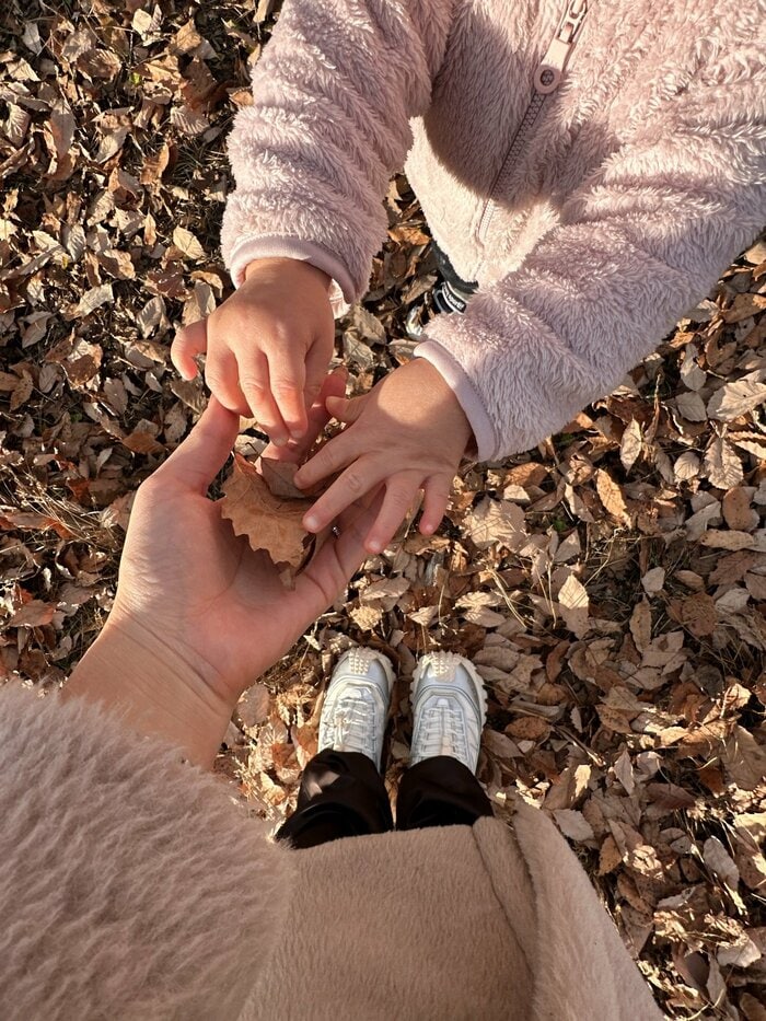 衛藤さんに1枚の落ち葉をプレゼント。衛藤さん目線で撮影されていて、身長差にほっこりしてしまいますね。