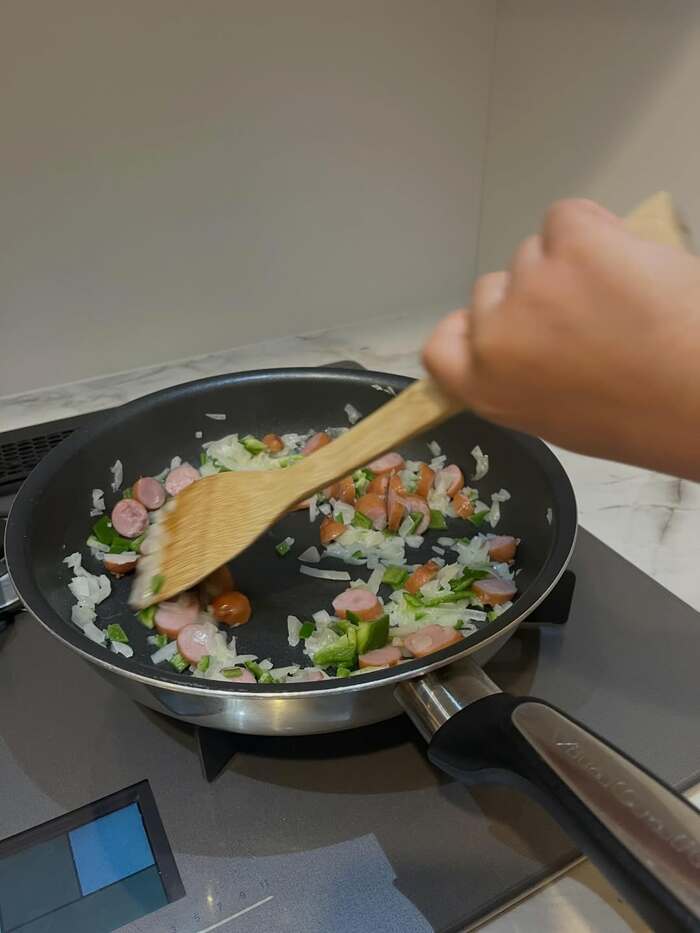 他にも、木べらを持ち、細かく刻んだピーマンやたまねぎ、ウインナーなどをじっくりコンロで火にかけているようなショットも。いい具合に油が絡んでいるようで、具材がつやっと光っています。最後に山口さんは「1番のお目当ては 味見なんだってことはわかっている。笑」と、娘の隠されたかわいい本音を明かしています。