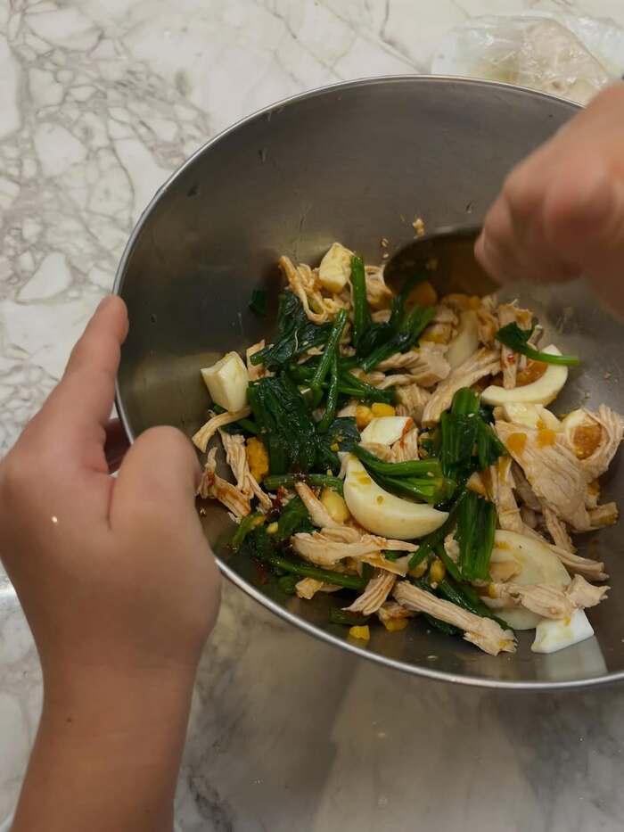 公開された写真には、鶏のささみ、ほうれんそう、ゆでたまごなどの材料が入ったボウルをかきまぜている小さな手が!しっかりと味が混ざるように丁寧にまぜています。