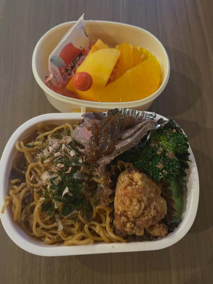 そして、やきそばがメインの日も。麺の上には青のりやかつおぶしなどがふられていて、とってもおいしそうです。どのお弁当にも必ず果物が付いているところにも山口さんの愛情が感じられます。