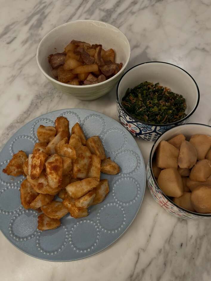 まずは「収穫した野菜は 里芋のから揚げ 里芋の煮っころがし 大根と豚バラ煮 大根の葉とあみえびのふりかけに」とつづり、家庭菜園で育てた野菜を使った4品を紹介。