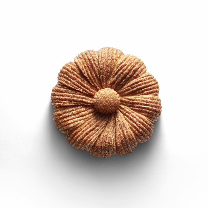 空気を含んだように折り重なる、ノルマンディー産バターとオーヴェルニュ産小麦によるパイ生地は、薄いカラメリゼをほんのりとまとい、あたたかな黄金色を帯びます。花弁のひとひらひとひらは、職人たちの丹念な手仕事によりかたどられ、端正な花冠(コロッラ)となり、生地に走る細い筋は、花の輪郭を写す植物画の繊細な筆致のようでもあります。