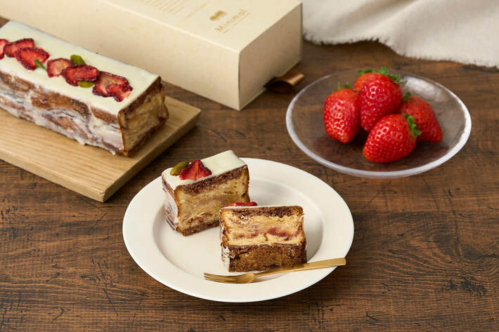 苺の生地の上下には、フルーティなマダガスカル産カカオ豆からお造りしたチョコレートクッキー生地を用いています。苺の風味に寄り添うチョコレートのフルーティな風味と、食感のアクセントをお楽しみください。さらに仕上げにはホワイトチョコレートをかけ、ドライ苺をトッピング。甘酸っぱい苺とチョコレートの相性を存分に楽しめる、見た目も華やかなガトーショコラです。