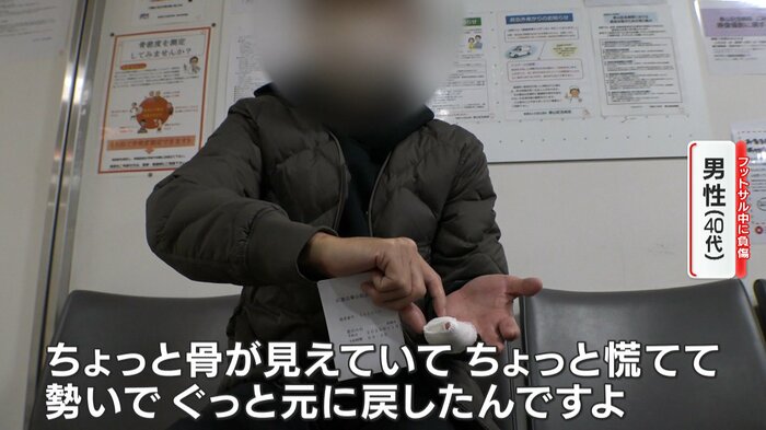 フットサルやっていて、ゴールキーパーをやっておりまして、その時におそらくですけど、来たシュートを止める時に指が。最初、突き指をしたと思っていて気にしてなかったんですけど、ふと見た時に指がこういうふうにこっち(横)にいってちょっと骨が見えていて、ちょっと慌てて勢いで、ぐっと元に戻したんですよ。