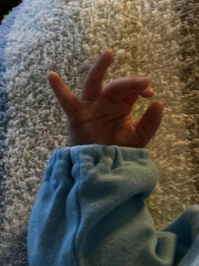気持ちよさそうにすやすや眠る次男ですが、その手を見てみると何やらポーズをしています。