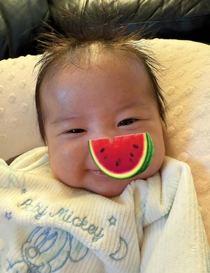ミッキーマウスが描かれたベビー服姿のお兄ちゃんは、ふっくらしたクッションの上に横たわり、カメラを見つめてにこっと笑っています。こぼれ落ちそうなほどぷくぷくしたほっぺや、ツンツン立ち上がった髪の毛がなんともいとおしく、愛嬌(あいきょう)いっぱいな笑顔がとってもかわいいですね。