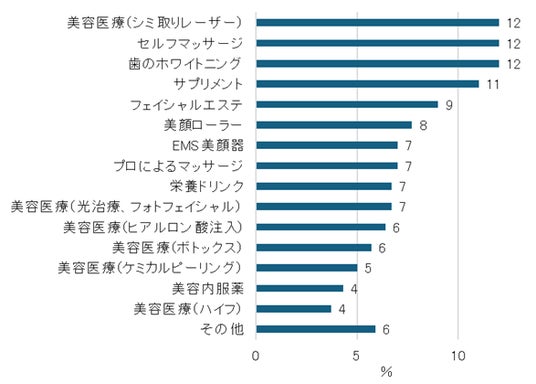 顔・肌の悩みについて聞いたところ、1位には「シミ・肝斑(44%)」、続いて「たるみ・ほうれい線(34%)」が挙がりました。また、直近1年で興味が増した顔の美容ケアの1位には、「セルフマッサージ(12%)」や「歯のホワイトニング(12%)」と同率で美容医療の「シミ取りレーザー(12%)」が挙がり、セルフマッサージと同じくらい身近なケア方法になってきているようです。