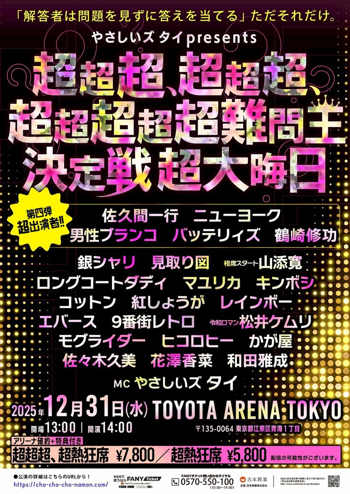 2025年12月31日(水)、TOYOTA ARENA TOKYOを舞台に開催される、やさしいズタイpresents『超超超、超超超、超超超超超難問王決定戦 超大晦日』の追加出演者が決定しました。「超大晦日の最終追加超難問チャレンジャー」として佐久間一行、ニューヨーク、男性ブランコ、バッテリィズ、QuizKnock・鶴崎修功が参戦します。“超”豪華出演者が加わり、年末の公演を盛り上げます。