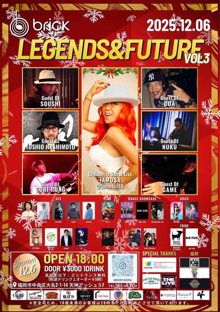 同店では、世代やジャンルを越えて「音楽で人がつながる場」をつくるシリーズ企画として『LEGENDS & FUTURE』を立ち上げ、福岡のナイトカルチャーにゆかりの深いDJ・アーティストが出演してきました。今回の「VOL.3」は、その第3弾となるクリスマス・スペシャルです。