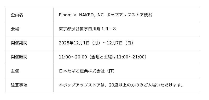 株式会社ネイキッド(英語表記:NAKED, INC.、所在地:東京都渋谷区、代表:村松亮太郎)は、日本たばこ産業株式会社(JT)が、MEDIA DEPARTMENT TOKYO(東京都渋谷区宇田川町19−3)にて、2025年12月1日(月)~12月7日(日)まで期間限定で開催中のポップアップストア 「Ploom × NAKED, INC. ポップアップストア渋谷」 の2Fイマーシブエクスペリエンスエリアでコラボレーションしています。