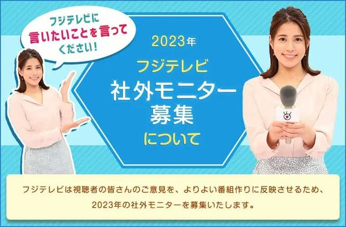 フジテレビは視聴者のみなさんのご意見を、よりよい番組作りに反映することを目的に、2022年11月14日(月)から12月23日(金)まで2023年の社外モニターを下記要領にて募集しています。